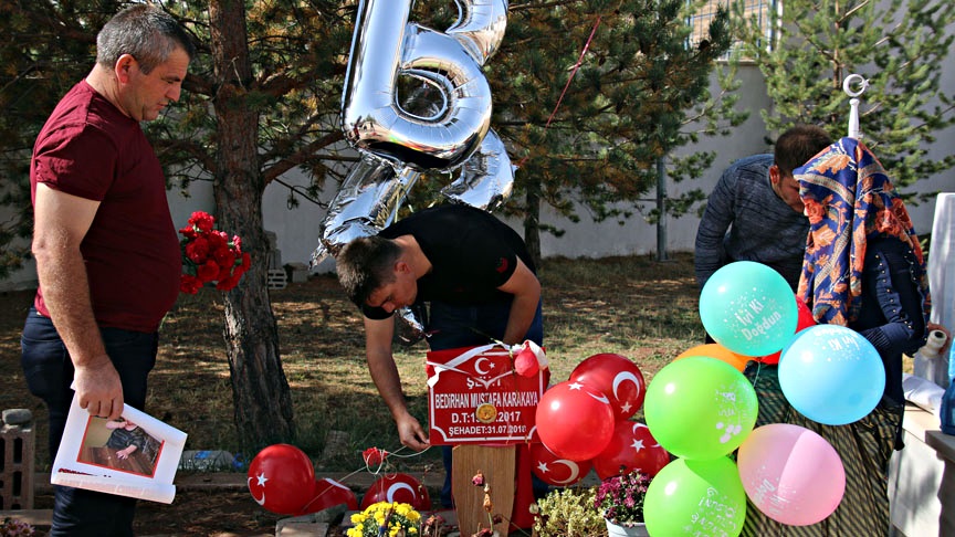 Hakkari'nin Yüksekova ilçesinde, PKK saldırısında annesiyle birlikte şehit olan 11 aylık Bedirhan Mustafa Karakaya'nın ilk doğum günü, babası ve yakınları tarafından mezarı başında kutlandı. Acılı baba Jandarma Astsubay Çavuş Serkan Karakaya, "Cennetteki ilk yaşı kutlu olsun. Peygamber Efendimizle, meleklerle ve diğer aziz şehitlerle birlikte cennette ilk yaşını kutluyor" dedi.