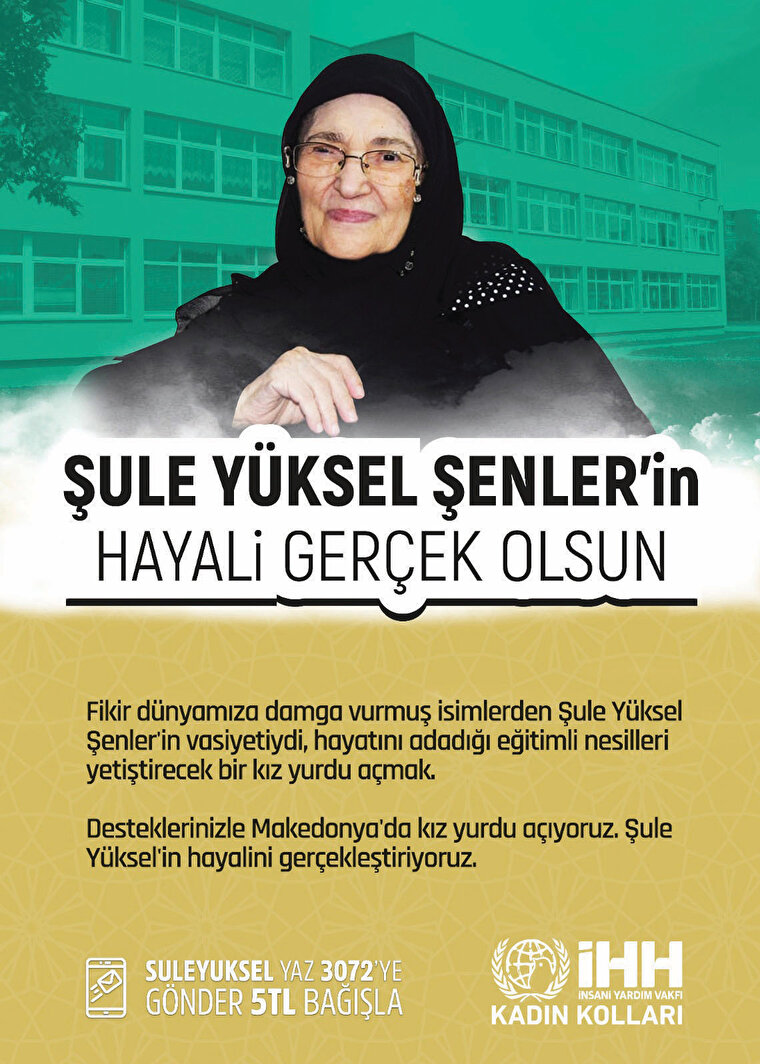 Kısa bir süre önce vefat eden gazeteci yazar Şule Yüksel Şenler’in hayali gerçek oluyor. İHH İnsani Yardım Vakfı hayırseverlerin destekleriyle Yüksel adına Kuzey Makedonya’da 100 öğrenci kapasiteli kız yurdu inşa edecek.