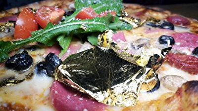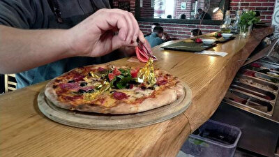 Bursa'da İtalyan mutfağı ustası İrfan Yalçın, 24 ayar yaprak altında altınlı pizza yaptı. Hazırladığı ürünü müşterilerine sunan Yalçın, olumlu geri dönüşler aldığını belirterek, "Pizzanın fiyatını yalnızca 100 lira olarak belirledik. Tarihte Firavun'un yediği rivayet edilen altını herkesin denemesi için bu fiyattan sunduk" dedi. Sertifikalı 24 ayar altınlı pizzayı yemeye gelen müşteriler ise sosyal medyayı salladı.