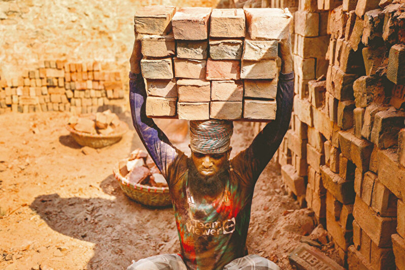 Zor şartlar, düşük ücret ve ağır hayat. Bangladeşli tuğla işçisinin hayatının özeti bu olabilir. Hayatı tuğlalarla örerken başında taşımak zorunda olduğu yükler tabloyu ağırlaştırıyor. AA fotoğrafçısı Niamul Rifat hayatın rengine boyanmış işçiyi insanlık defterine kaydediyor.