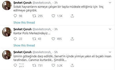 Sosyal medya hesabından olayı paylaşan oyuncu Şevket Çoruh, “İzmir’in göbeğinde darp edildik... Servet’in içinde yirmiye yakın eli bıçaklı insan tarafından. Canımızı kurtardık... Şimdilik... Kantar Polis Merkezindeyiz. Sokak hayvanlarını ezmeye çalışan bir taşıta müdahale ettiğimiz için linç edilmeye çalışıldık” dedi.
