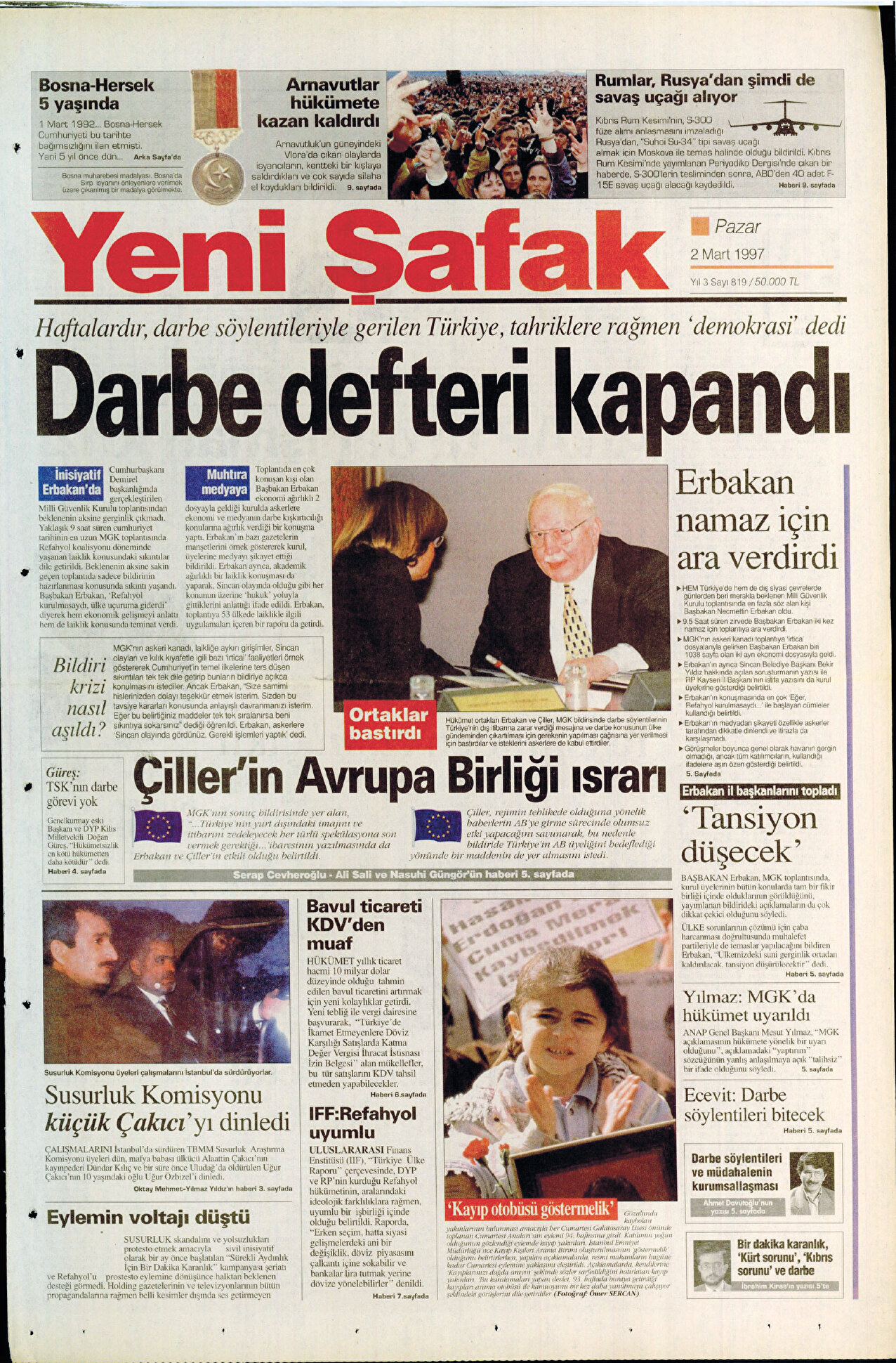 - Vesayetçi askerler eliyle darbe söylentilerinin sürekli ısıtıldığı söz konusu günlerde Yeni Şafak tarafını belli etmiş 2 Mart’ta vesayetçilere net mesaj olacak şekilde ‘Darbe Defteri Kapandı’ başlığıyla çıkmıştı. Refahyol hükümetini demokratik platformlarda engellemeyen ve tek parti dönemine özlem duyan çevrelerin sonuçsuz kalan