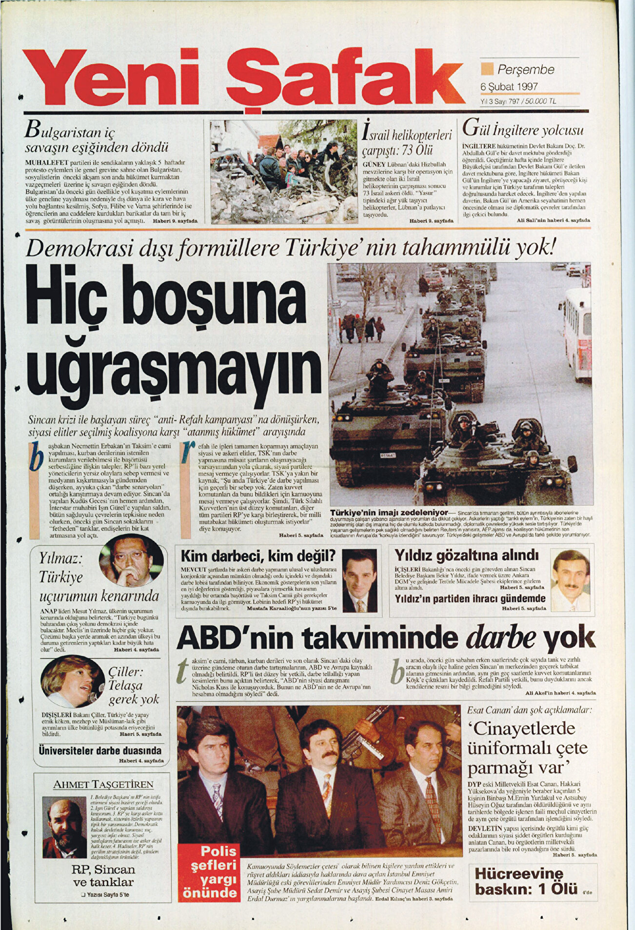 4 Şubat’ta Ankara’nın Sincan ilçesi güne tank sesleriyle uyandı. 15 tank ve 20 zırhlı araçtan oluşan konvoyun geçidi askerin darbe uyarısı olarak algılandı. Dönemin Genelkurmay İkinci Başkanı Orgeneral Çevik Bir, o görüntü için, “Demokrasiye balans ayarı yaptık” ifadesini kullandı. “Askerin uyarısı” olarak nitelendirilen bu gelişme üzerine Sincan Belediye Başkanı görevden uzaklaştırdı. Belediye Başkanı Bekir Yıldız ile 9 arkadaşı “halkı kin ve düşmanlığa tahrik” iddiasıyla tutuklandı. Yeni Şafak bu karanlık günlerde, ‘“Hiç Boşuna Uğraşmayın”, demokrasi dışı formüllere Türkiye’nin tahammülü yok” dedi.