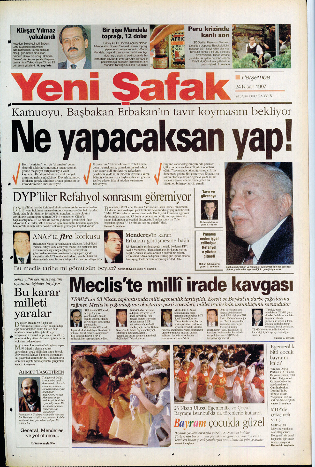 - 28 Şubat kararları üzerinden iki ay geçmesine rağmen tartışmaları bir türlü bitmek bilmedi. Hem içeriden hem de dışarıdan gelen sistemli saldırılar sonucunda icraat yapmak yerine meşruiyet tartışmalarıyla vakit kaybeden Refahyol hükümetine 24 Nisan 1997’de kamuoyunun, Başbakan Erbakan’ın tavır koyması bekliyor ifadeleriyle ‘Ne Yapacaksan Yap!’ başlığıyla çıktı.