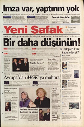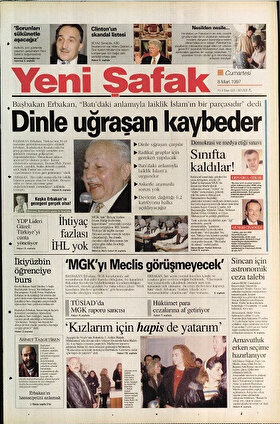 - Süreçte attığı başlıklarla kendinden söz ettiren Yeni Şafak 8 Mart’ta ‘Dinle Uğraşan Kaybeder’ başlığıyla çıktı. Başbakan Necmettin Erbakan’ın “Batı’daki anlamıyla laiklik İslam’ın bir parçasıdır” sözlerinin yer aldığı o günde Yeni Şafak’ta MGK’nın ‘İhtiyaç fazlası İmam Hatip Liselerinin kapatılması’ yönündeki tavsiye kararlarına tepkiler yer aldı. İHL’lerin Türkiye’de hiçbir zaman ihtiyaca cevap verecek sayıya ulaşamadığı, bu alanda duyulan okul ihtiyacının her geçen gün daha da arttığı okuyucularına duyuruldu.