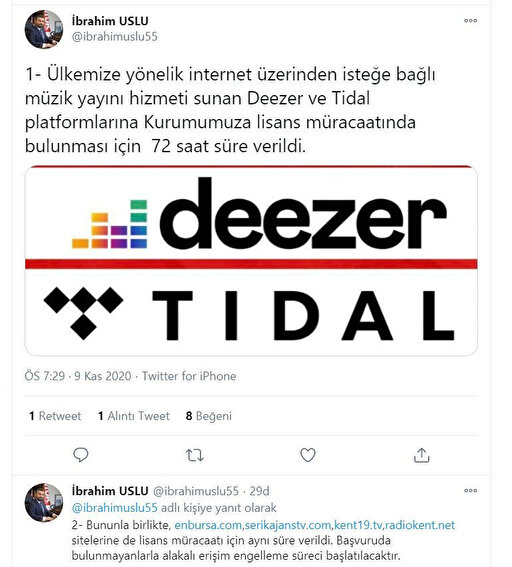 Uslu, Twitter hesabından yaptığı açıklamada, "Ülkemize yönelik internet üzerinden isteğe bağlı müzik yayını hizmeti sunan 'Deezer' ve 'Tidal' platformlarına, kurumumuza lisans müracaatında bulunması için 72 saat süre verildi. Bununla birlikte, 'http://enbursa.com', 'http://serikajanstv.com', 'http://kent19.tv', 'http://radiokent.net' sitelerine de lisans müracaatı için aynı süre verildi. Başvuruda bulunmayanlarla alakalı erişim engelleme süreci başlatılacaktır" dedi.