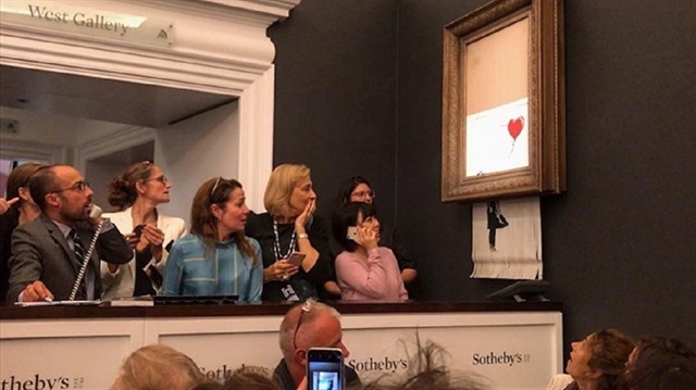 - Ünlü sokak sanatçısı Banksy’ın kendini imha eden Balonlu Kız tablosu, sosyal medyada en çok konuşulan haberlerin başında geliyor. Eser, Sotheby’s müzayede evinde satıldıktan hemen sonra katılımcıların şaşkın bakışları altında, çerçevesinin içindeki kâğıt öğütücü tarafından parçalara ayrıldı.