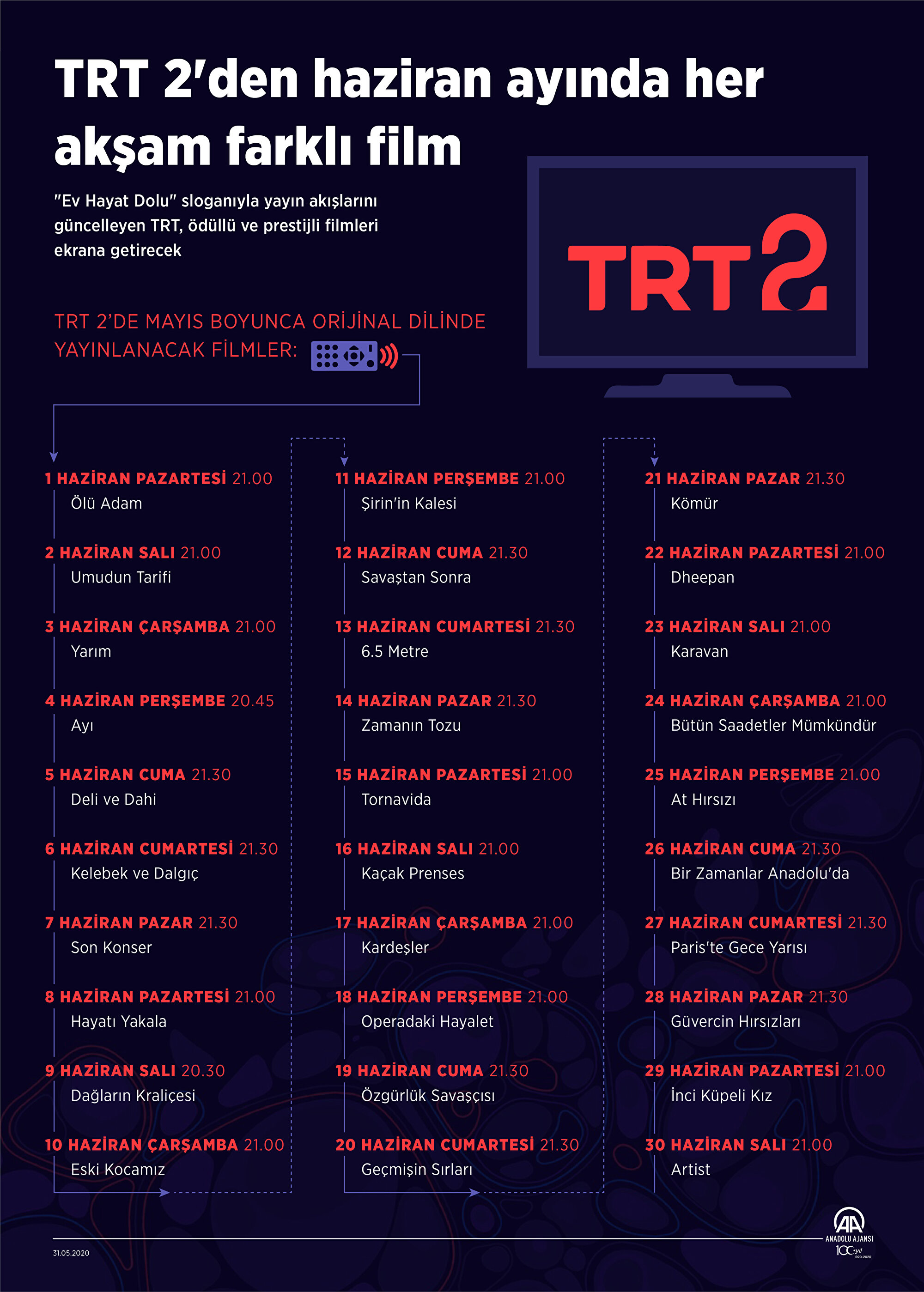 Kültür sanat kanalı TRT 2, bu kapsamda haziran ayı boyunca her akşam farklı bir filmi sinemaseverlerin beğenisine sunulacak.