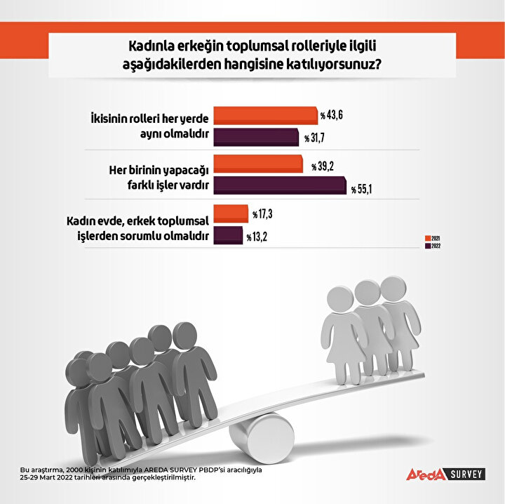 2021 yılının aynı ayında gerçekleştirilen araştırmasının sonuçlarına göre, bu yıl kadın ve erkeğin yapacağı farklı işlerin olduğuna ilişkin anlayışta artış olduğu görülürken, kadınla erkeğin rollerinin her yerde aynı olduğu düşüncesi ile kadının evden, erkeğin ise toplumsal işlerden sorumlu olduğu yönündeki düşüncede düşüş yaşandığı tespit edildi.