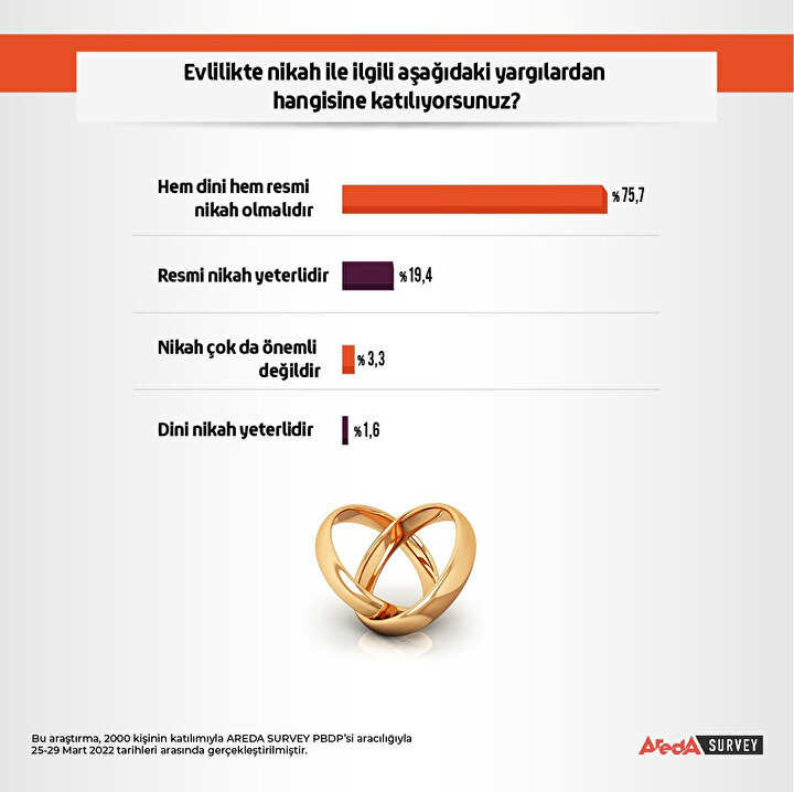 Areda Survey’in evlilikte nikah konusunun Türkiye’de nasıl karşılandığını sorgulayan, “Evlilikte nikah ile ilgili aşağıdaki yargılardan hangisine katılıyorsunuz?” sorusuna ise, katılımcıların yüzde 75,7’lik büyük çoğunluğu hem dini hem de resmi nikahın evlilik için gerekli olduğu yanıtını verdi.