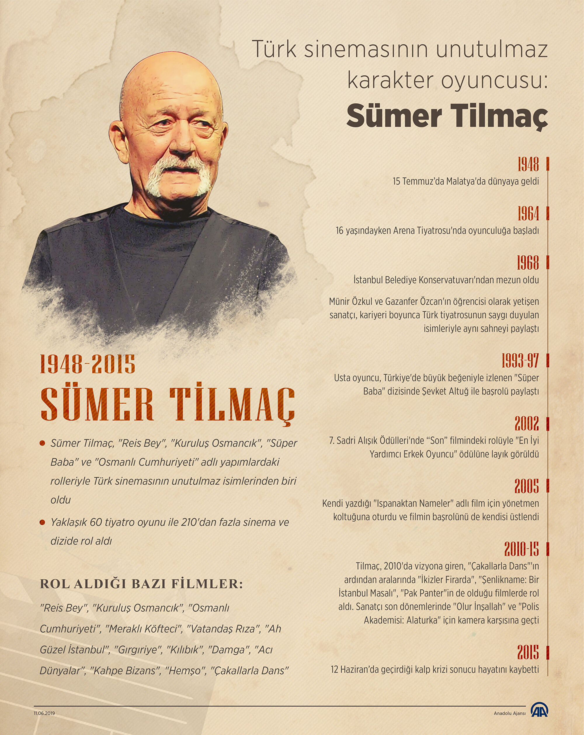 Yaklaşık 60 tiyatro oyunu ile 210'dan fazla sinema ve dizide rol alan oyuncu Sümer Tilmaç, vefatının 4. yılında yad ediliyor