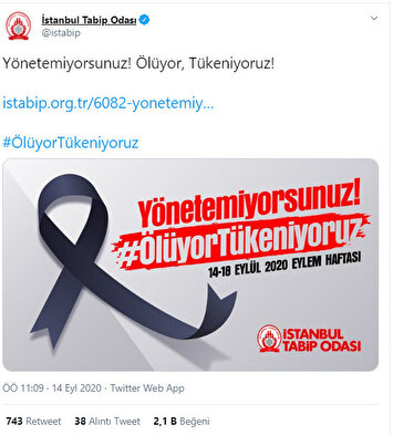 "Türk Tabipleri Birliği isimli ihanet oluşumu sözde artan vakalara, hayatını kaybeden insanlarımıza ve sağlık çalışanlarımıza dikkat çekmek maksadıyla tüm sağlık kurumlarında siyah kurdele takacakmış.