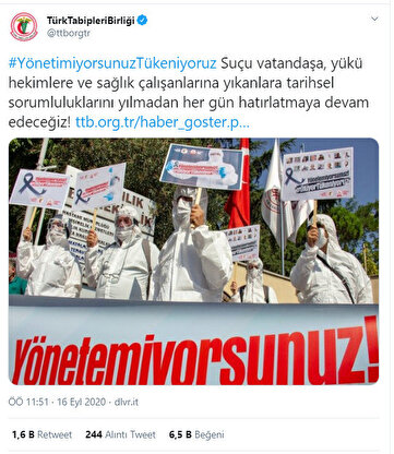Türk Tabipler Birliği koronavirüs salgını yaşanırken sosyal medya üzerinden her gün yaptıkları provokatif açıklamalar ile tepki topladı. Koronavirüs ile mücadelede ikinci dalga yaklaşırken Tabipler Birliği, Sağlık Bakanı Fahrettin Koca ve ekibini hedef göstererek yaptıkları 'yönetemiyorsunuz' eylemi gündeme oturdu. Tabipler Birliği, Suriye'de ve yurt içinde yürütülen bir çok terör operasyonuna karşı çıkmıştı. Birliğin bilinen herhangi bir bilimsel ya da tıbbi çalışması yok.
