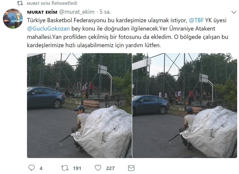 Ümraniye'de Basketbol oynayan çocukları izleyen kağıt toplayıcı genç, sosyal medya kullanıcı Murat Ekim'in dikkatini çekti. Ekim, sosyal medya hesabından kağıt toplayan çocuğun resmini paylaşarak, "Türkiye Basketbol Federasyonu bu kardeşimize ulaşmak istiyor" dedi.