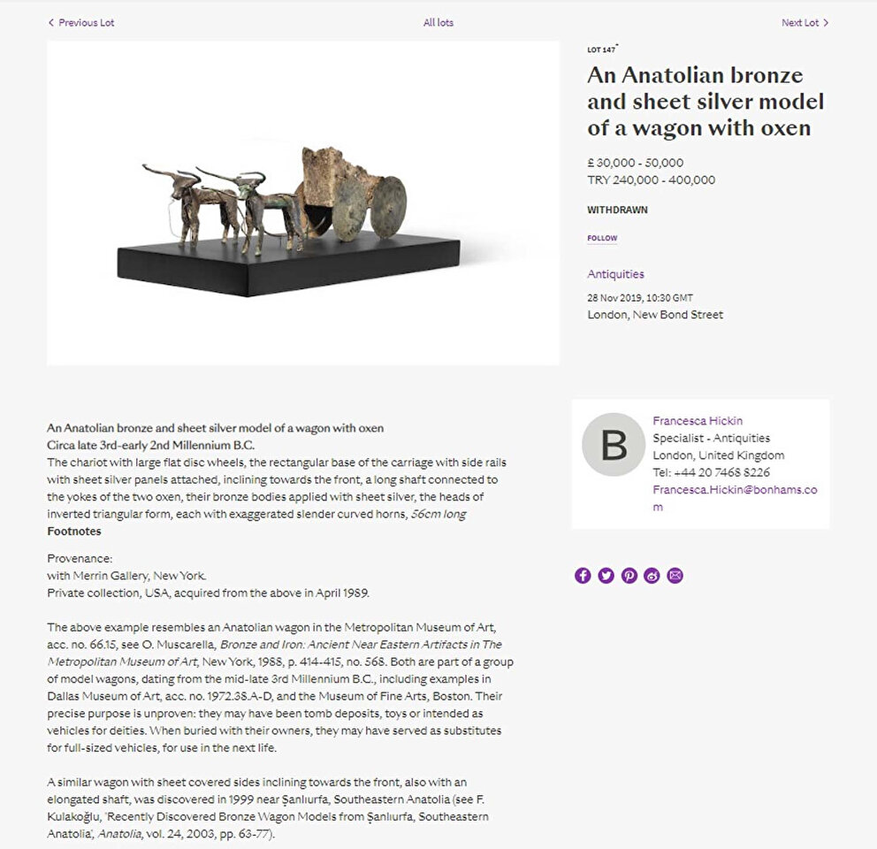 Kültür ve Turizm Bakanlığınca ülkeye iadesi açıklanan iki eserden biri olan 'boğa arabası'nın, İngiltere'deki müzayede evinin satış kataloğuna Türk profesörün bilimsel makalesi ile konulması sonucu, Türkiye'den kaçırıldığının tespit edildiği ortaya çıktı. Bakanlık uzmanları, eserin fiyatını artırmak için konulan makalenin sahibi Prof. Dr. Fikri Kulakoğlu ile irtibata geçerek, eserin Şanlıurfa Müzesi koleksiyonuna ait olduğunu saptadı.