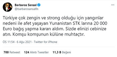 "Türkiye çok zengin ve strong olduğu için yangınlar nedeni ile afet yaşayan Yunanistan STK'larına 20000 Euro bağış yapma kararı aldım. Siz de elinizi cebinize atın. Komşu komşunun külüne muhtaçtır"