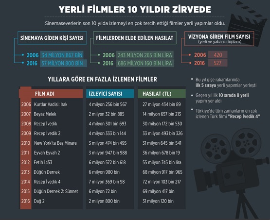Sinemaseverlerin son 10 yılda izlemeyi en çok tercih ettiği filmler yerli yapımlar oldu. Box Office Türkiye'den derlenen bilgilere göre, Türkiye'de gösterime giren filmler ve izleyici sayısı ile elde edilen hasılatlarda, son 10 yılda büyük artış yaşandı. Türkiye'de 2006 yılında yaklaşık 34 milyon 867 bin kişi sinemaya giderken, 2016'da izleyici sayısı yaklaşık 57 milyon 800 bine ulaştı. Filmlerden elde edilen hasılat ise 2006'da yaklaşık 243 milyon 265 bin lirayken, 2016'da yaklaşık 686 milyon 160 bin lira oldu.