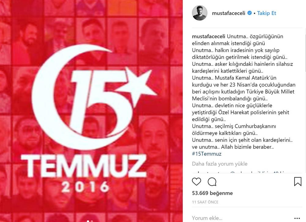 Ünlüler sosyal medya hesaplarından 15 Temmuz mesajları paylaştı. 2016 yılında 15 Temmuz’da yaşanan darbe girişiminin, ikinci yıl dönümünde ünlüler sosyal medya hesaplarından mesajlar yayınlayarak darbeyi bir kez daha kınadılar.