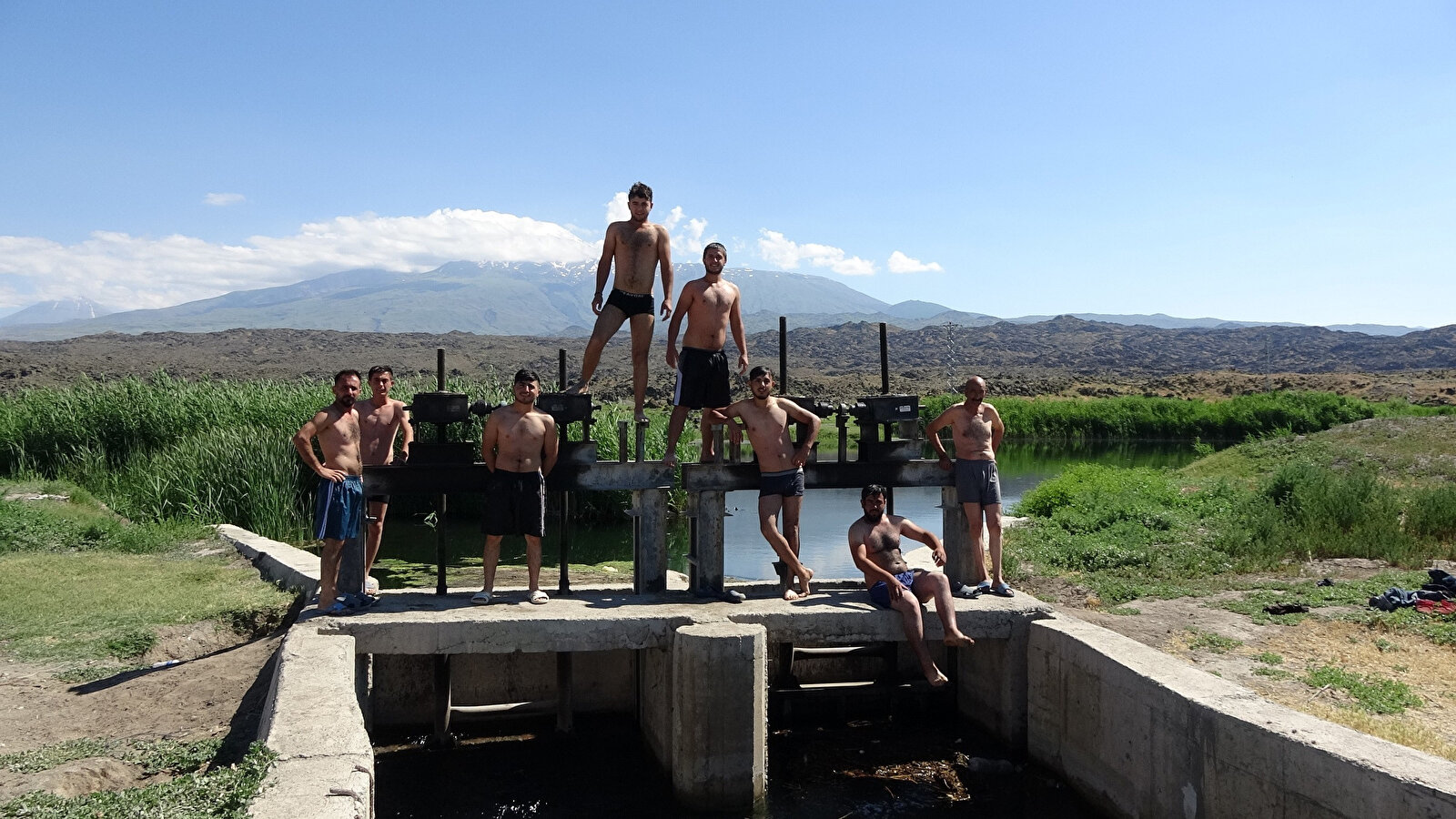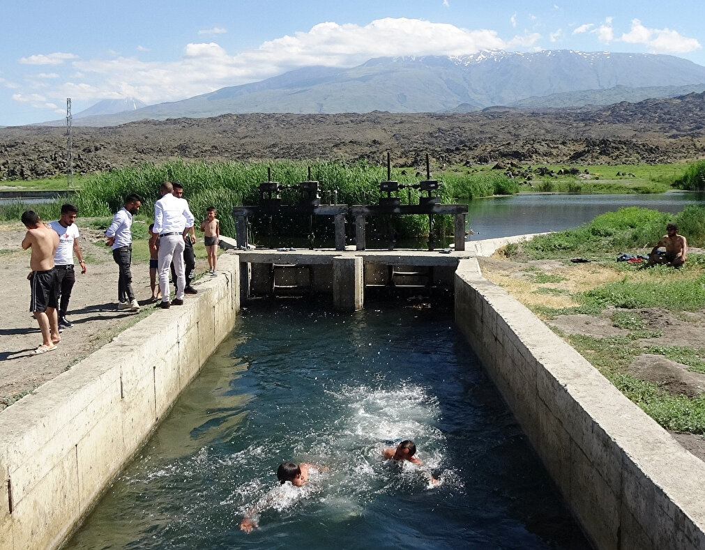 - Tarlada çalışanların dışında piknik yapmaya gelen kişilerin de bu suya girdiğini söyleyen Bayram Çimen ise, "Her yerde olduğu gibi bizim buralarda da havuz yapılsa iyi olur. Sıcak günlerde DSİ'nin, Ağrı Dağı manzaralı sulama kanalını havuz gibi kullanıyoruz. Bizim plajımız da burası. Bazıları da çocuklarını kucaklarına alarak yüzdürüyor" dedi.