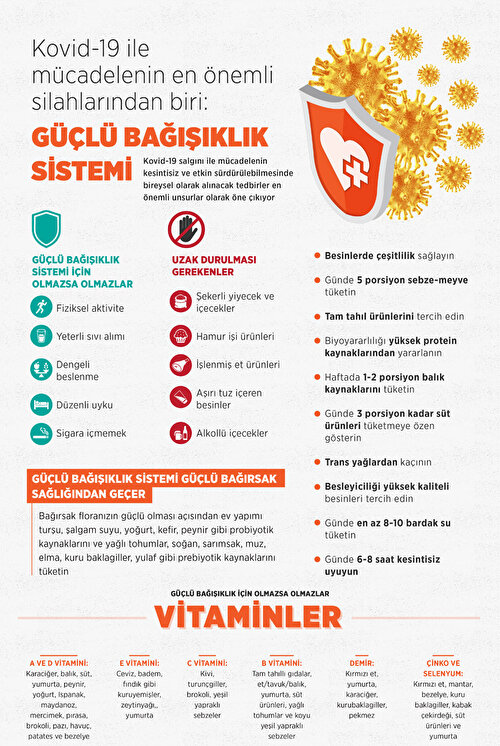 - "Sağlık açısından önceliğe sahip olan beslenmede antioksidandan zenginbesinleri tercih etme, çeşitli sebze, meyve, kuruyemiş, tahıltüketimi ile birlikte yeterli lif, vitamin, mineral alımı vekaliteli protein tüketilmesi büyük önem taşıyor. Beslenmenin yanında fiziksel aktivite, uyku düzeni ve süresi, bireylerin vücutağırlıkları, sahip oldukları kronik hastalıklar ile buna bağlıkullanılan ilaç ve besin takviyeleri, alkol ve sigara kullanımı,yeterli sıvı alımı ve hijyene dikkat etmek bağışıklığıetkilemektedir."