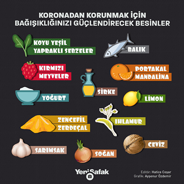 Türkiye'de koronavirüs vakalarının artmasının ardından çeşitli vitamin haplarına, damlalara, çinko ve gıda takviyelerine olan ilgi de büyük oranda arttı. Gelişigüzel ilaç kullanımının salgına karşı bir fayda sağlanamayacağının altını çizen uzmanlar, bu süreçte bağışıklık sisteminin güçlü tutulmasının yeterli olacağını belirtiyor. Peki bağışıklık sisteminini güçlü tutmak için neler yapmalıyız? Uzman Diyetisyen Yeliz Vergi yenisafak.com'a anlattı: