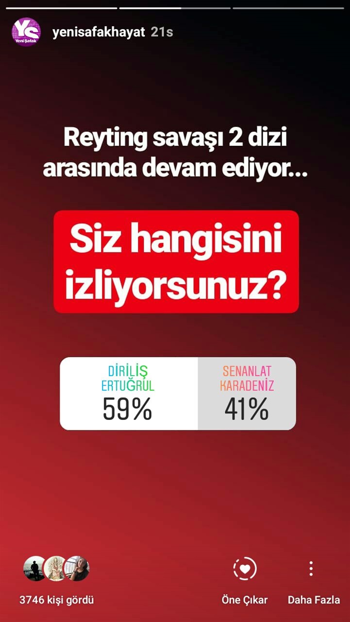 Son haftalarda reytinglerde hatırı sayılır bir oran elde eden Sen Anlat Karadeniz TRT 1'in fenomen dizisi Diriliş Ertuğrul'un tahtını sallıyor mu? Bu soruyu Yeni Şafak Hayat'ın Instagram takipçilerine sorduk. Çıkan sonuçlar bizi şaşırtmadı, takipçiler "Diriliş Ertuğrul" dedi.