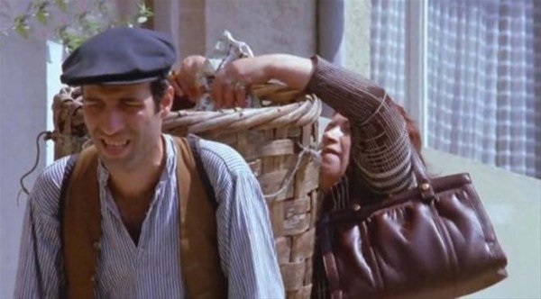 İlk sahnede Kemal Sunal sepeti taşıyor.