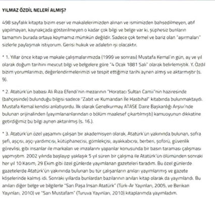 Kitabın içindeki bilgilerin teyidi noktasında birçok soru işareti sosyal medyada tartışma konusu olurken, Anıtkabir Derneği Yönetim Kurulu Üyesi Ali Güler, Yılmaz Özdil'in kitabındaki bilgilerin derneğin makalelerinden atıfsız ve kaynakçasız olarak birebir kopyalandığını açıkladı.
