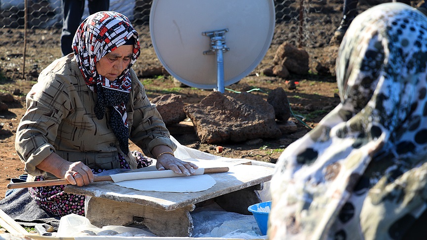 Harekatta görev alan askerleri belirli aralıklarla ziyarete giden ve ihtiyaçlarını soran Deveci, Suriye sınırında kaldığı Yörük çadırında komşularıyla askerler için yufka ekmek yapıyor.