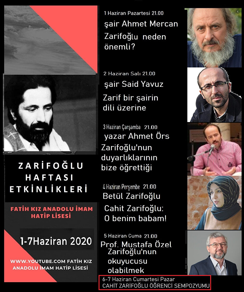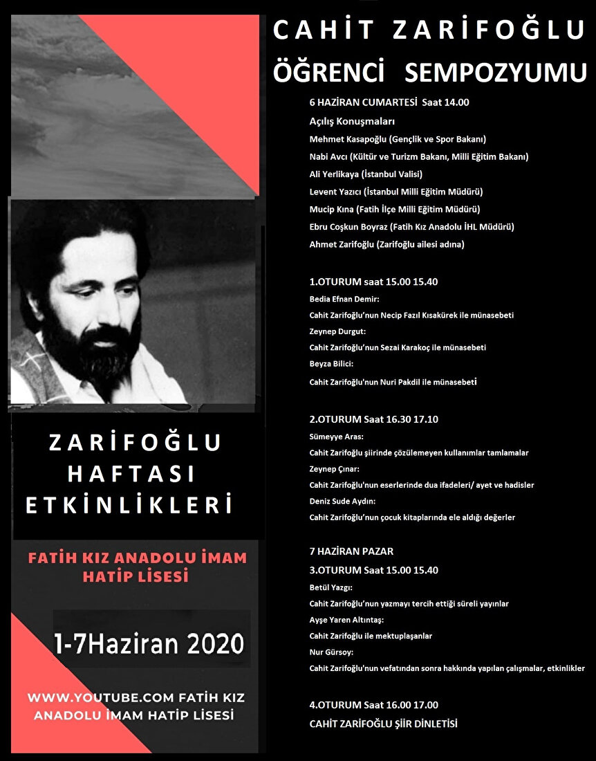 Fatih Kız Anadolu İHL, pandemi sürecinde bir ilke imza atarak şair Cahit Zarifoğlu ile ilgili ilk öğrenci sempozyumunu gerçekleştiriyor. 1-7 Haziran tarihlerini Zarifoğlu haftası ilan eden okul, her akşam önemli bir ismi online olarak ağırlıyor. Zarifoğlu'nun evrensel bir şairimiz olduğunu söyleyen Okul Müdürü Ebru Coşkun Boyraz, "Etkinlik tamamen Kültür Edebiyat Kulübü öğrencilerimiz tarafından organize edildi. Konukları da kendileri ayarladı" dedi.