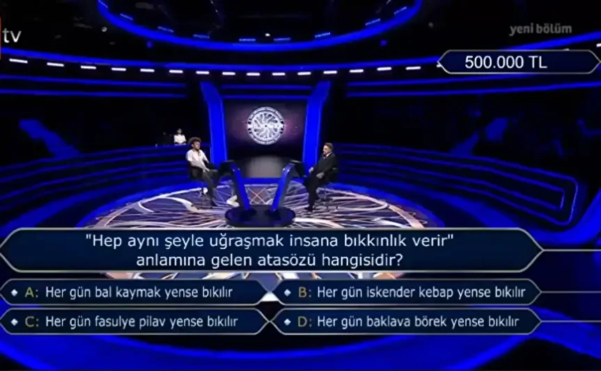 'Hep aynı şeyle uğraşmak insana bıkkınlık verir' anlamına gelen atasözü hangisidir? Kim Milyoner Olmak İster? yarışmasının bu akşamki yeni bölümünde, bir yarışmacı 500 bin TL değerindeki soruyu açmayı başardı. İşte bu sorunun doğru yanıtı.