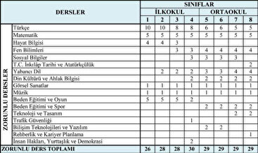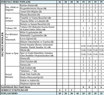 Toplam 26 saat zorunlu ders var. 4 saatte Serbest Etkinlikler dersi vardır. Toplam haftalık ders saatleri 30'dur.