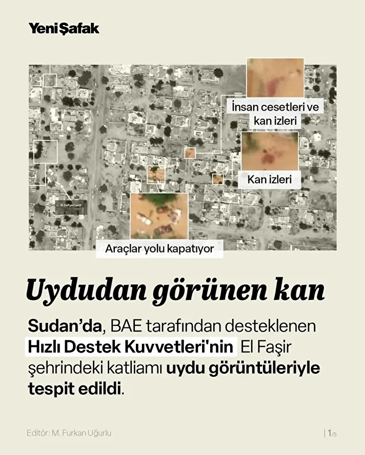 Sudan'da, Hızlı Destek Kuvvetleri'nin El Faşir şehrindeki katliamı uydu görüntüleriyle tespit edildi. Görüntülerde milis araçlarının kapattığı yollarda insan cesetleri ve kan izleri göze çarpıyor.