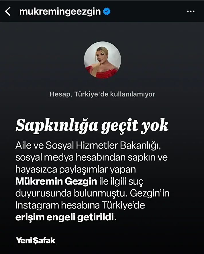 Aile ve Sosyal Hizmetler Bakanlığı'nın yaptığı şikayet sonrasında, sosyal medya hesabında çocukları da kullanarak sapkın ve aklaksızca paylaşımlar yapan Mükremin Gezgin'in Instagram hesabına Türkiye'de erişim engeli getirildi.