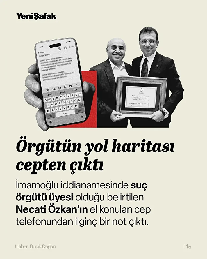 İmamoğlu iddianamesinde suç örgütü üyesi olduğu belirtilen Necati Özkan’ın el konulan cep telefonundan ilginç bir not çıktı. Örgütün yol haritası olarak değerlendirilen notta, “Partinin başına geçmek”, “Trump ile görüşme”, “Mansur şehirlerde büro açıyor, milliyetçi kanalla görüşüyor”, “Örgüt Mansur’u çıkaracak”, “Vekiller sarhoş geliyor, odalarında alkol var”, “Milletvekili istifa ve ara seçim” gibi ifadeler dikkat çekti.