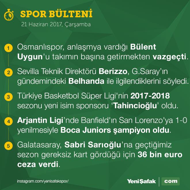 👉 Osmanlıspor, anlaşmya vardığı Bülent Uygun'u takımın başına getirmekten vazgeçti. belirtildi.👉 Sevilla Teknik Direktörü Berizzo, G.Saray'ın gündemindeki Belhanda ile ilgilendiklerini söyledi.👉 Türkiye Basketbol Süper Ligi'nin 2017-2018 sezonu yeni isim sponsoru 'Tahincioğlu' oldu.👉 Arjantin Ligi'nde Banfield'ın San Lorenzo'ya 1-0 yenilmesiyle Boca Juniors şampiyon oldu.👉 Galatasaray, Sabri Sarıoğlu'na geçtiğimiz sezon gereksiz kart gördüğü için 36 bin euro ceza verdi.