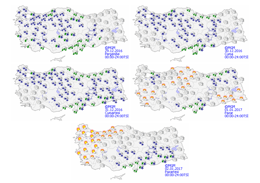 Yapılan son değerlendirmelere göre; Ülkemizin geneli çok bulutlu, Marmara'nın güney ve doğusu, Ege, Akdeniz, İç Anadolu, Batı ve Orta Karadeniz, Doğu Anadolu'nun batısı ile İstanbul, Tekirdağ, Trabzon, Gümüşhane, Erzincan, Bingöl, Gaziantep, Kilis, Adıyaman, Hakkari çevreleri ile Kırklareli'nin kıyı ve Diyarbakır'ın kuzey kesimlerinin yağışlı geçeceği tahmin ediliyor. Yağışların; kıyı kesimlerde yağmur iç kesimlerde karla karışık yağmur ve genellikle kar şeklinde olacağı ve Marmara'nın doğusunun iç kesimleri, İç Ege, İç Anadolu'nun güney ve batısı, Toroslar Mevkii ve Batı Karadeniz'in iç kesimlerinde yoğun kar, Akdeniz kıyı kesimi, Batı Karadeniz kıyıları, Muğla ve Kocaeli ile Sakarya'nın kıyı kesimlerinde kuvvetli yağmur şeklinde olacağı tahmin ediliyor. Kuzeydoğu kesimlerde kuvvetli olmak üzere iç ve doğu kesimlerde buzlanma ve don olayı ile sabah ve gece saatlerinde Göller Yöresi ve doğu kesimlerde yer yer pus ve sis hadisesi bekleniyor.