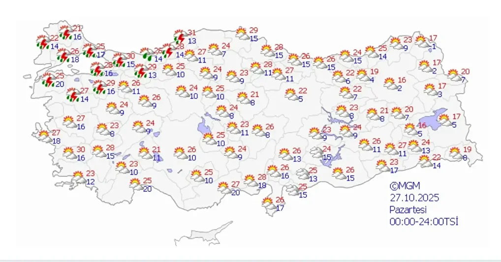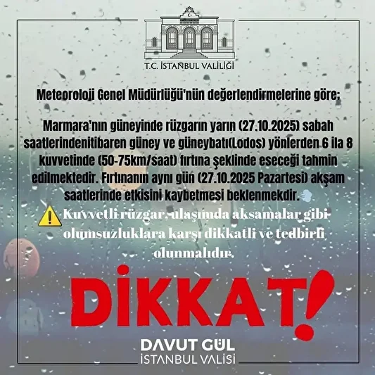 Marmara'nın güneyinde rüzgarın yarın (27.10.2025) sabah saatlerinden itibaren güney ve güneybatı (Lodos) yönlerden 6 ila 8 kuvvetinde (50-75 km/saat) fırtına şeklinde eseceği tahmin edilmektedir. Fırtınanın aynı gün (27.10.2025 Pazartesi) akşam saatlerinde etkisini kaybetmesi beklenmektedir. Kuvvetli rüzgar, ulaşımda aksamalar gibi olumsuzluklara karşı dikkatli ve tedbirli olunmalıdır.