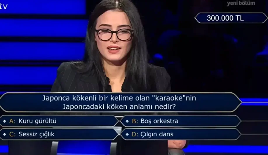 Japonca kökenli bir kelime olan 'karaoke'nin Japoncadaki köken anlamı nedir? Kim Milyoner Olmak İster yarışmasında sorulan ve 300 bin TL değerinde olan bu sorunun yanıtı belli oldu.