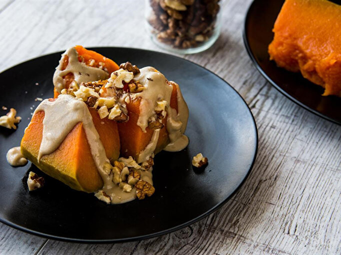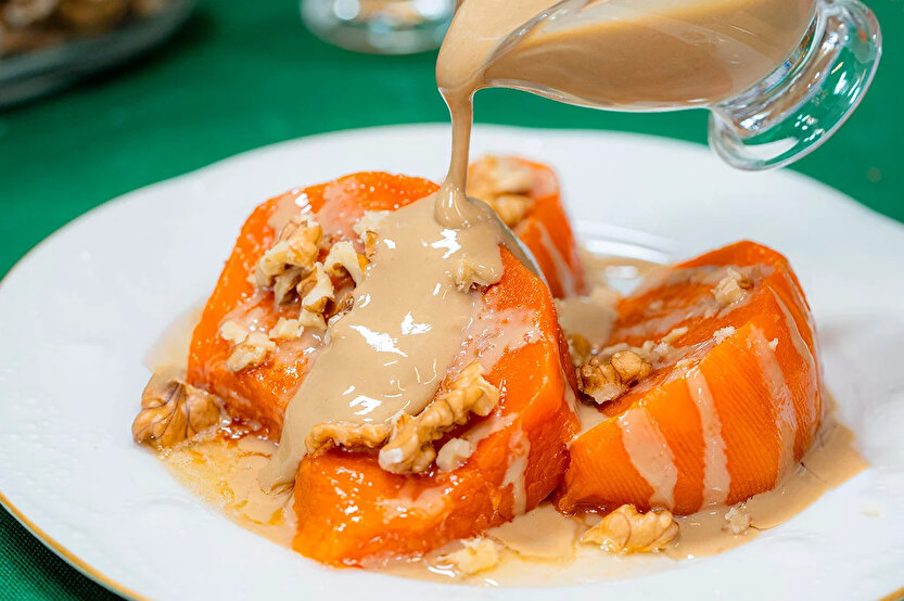 -Soğuduktan sonra balkabağı tatlısı servis tabağına alınır, üzerine tahin gezdirilip dövülmüş ceviz serpilerek servis edilir.