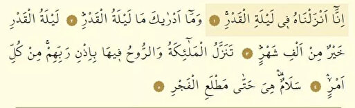İnna enzelnahü fiy leyletilkadr. Ve ma edrake ma leyletülkadr. Leyletülkadri hayrün min elfi şehr. Tenezzelülmelaiketü verruhu fiyha biizni rabbihim min külli emr. Selamün hiye hatta matle'ılfecr.