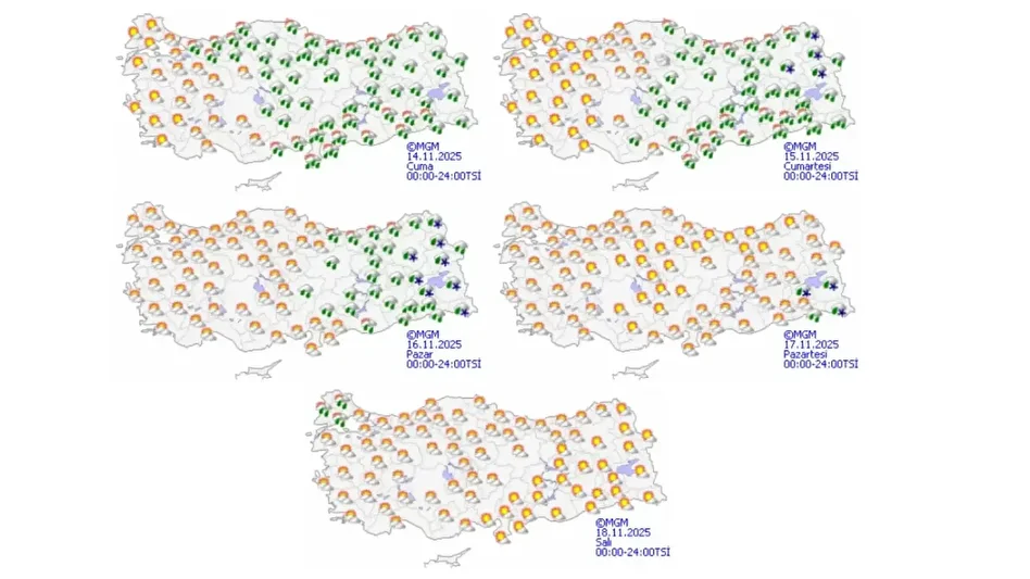 MGM'nin son tahminlerine göre yağışlar, 14 Kasım Cuma günü saat 00.00’da etkisini göstermeye başlayacak. Soğuyan hava ile birlikte öğle saatlerinden sonra 1200 metre üzeri bölgelerde yağmur, karla karışık yağmura ve yer yer kara dönecek. Bu durum, 15 Kasım Cumartesi sabah 08.00’e kadar sürecek.