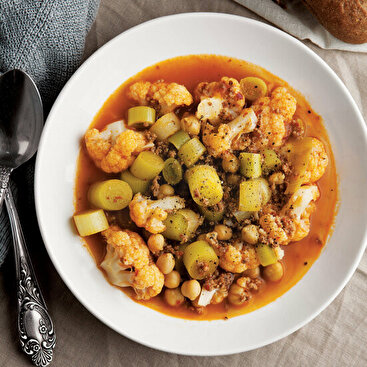 Nohutları ekleyip üzerini örtecek kadar sıcak su ilave edin. Tuzunu serpin. Nohutların pişmesine yakın karnabaharı ilave edin.