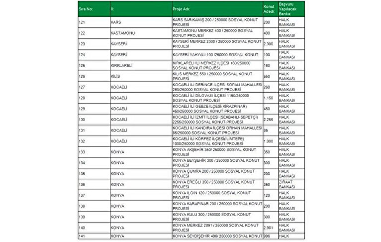 Cumhurbaşkanı Erdoğan'ın açıkladığı 250 bin konut, 100 bin altyapılı konut arsasının hangi il ve ilçelere yapılacağı belli oldu. Buna göre TOKİ konutları Kocaeli'de Derince, Dilovası, Gebze, İzmit, Kandıra ve Körfez ilçelerine yapılacak.