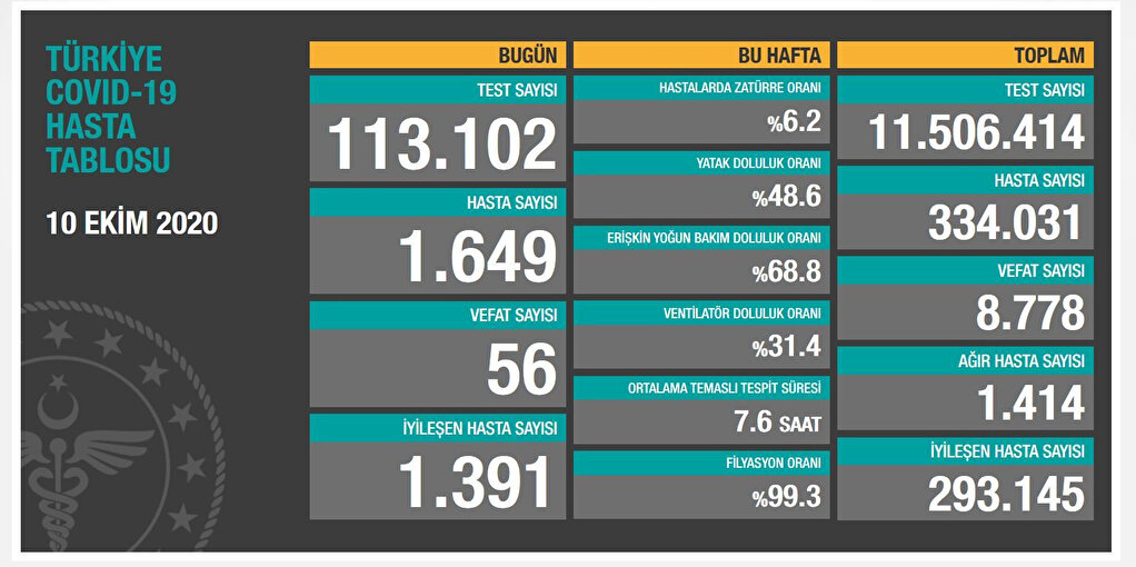 Türkiye'nin 10 Ekim koronavirüs tablosu açıklandı. Açıklanan verilere göre, Türkiye’de son 24 saatte korona virüsten 56 kişi hayatını kaybetti, bin 649 kişiye hastalık tanısı konuldu.