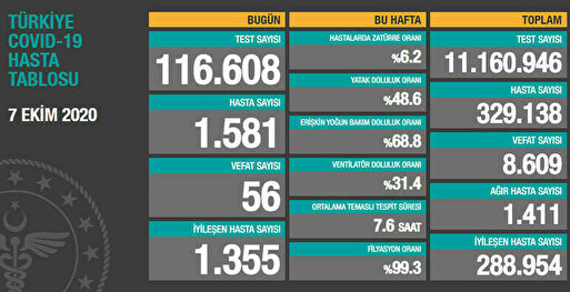 Toplam test sayısı 11 milyon 731 bin 350'ye ulaştı. Hasta sayısı 337 bin 147, vefat sayısı 8 bin 895, ağır hasta sayısı 1417, aktif hasta sayısı 32 bin 594 oldu.