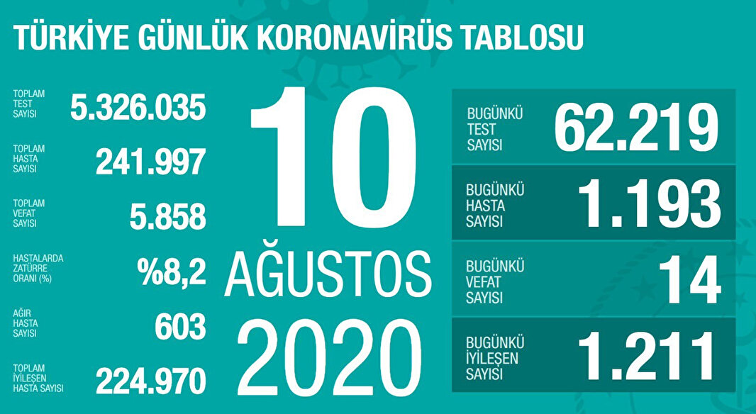 Sağlık Bakanı Fahrettin Koca, 15 Ağustos günü itibari ile son 24 saatte gerçekleşen koronavirüsle ilgili ölüm ve toplam vaka sayısını açıkladı. Bakan Koca, verileri Sağlık Bakanlığı Korona Tablosunun görseliyle duyurdu. Bugün 1256 kişiye koronavirüs (Kovid-19) tanısı konuldu, 21 kişi hayatını kaybetti, toplam vaka sayısı 248 bin 117, can kaybı 5 bin 955 oldu. Bakan Koca verileri duyurduğu paylaşımında vaka sayısının, son 45 günün en yüksek seviyesine ulaştığını belirterek uyarıda bulundu.