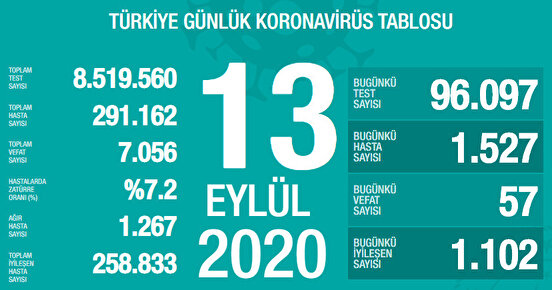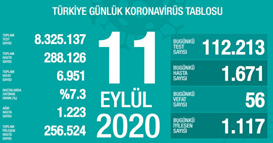 - Toplam test sayısı 8 milyon 855 bin 180, vaka sayısı 296 bin 391, vefat sayısı 7 bin 249 olarak kayıtlara geçti. Aktif hasta 26 bin 540, ağır hasta sayısı 1351, hastalarda zatürre oranı ise yüzde 7,1 oldu.