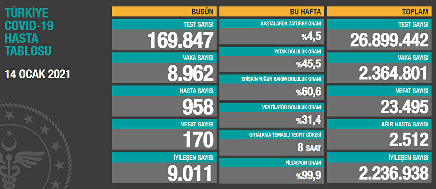 Haftalık verilere göre, bu hafta hastalarda zatürre oranı yüzde 4,5, yatak doluluk oranı yüzde 45,5, erişkin yoğun bakım doluluk oranı yüzde 60,6, ventilatör doluluk oranı yüzde 31,4, ortalama temaslı tespit süresi 8 saat, filyasyon oranı ise yüzde 99,9 olarak gerçekleşti.