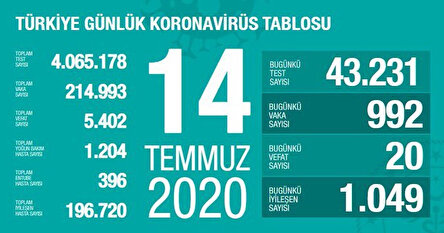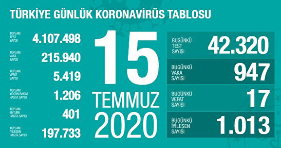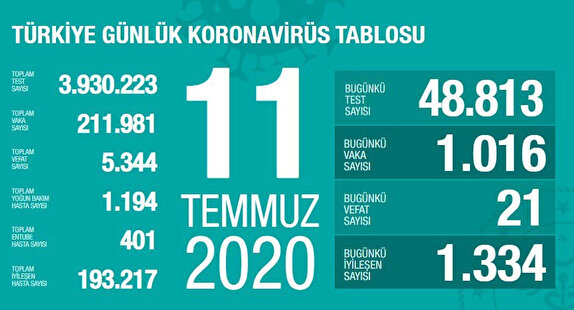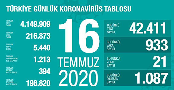 Sağlık Bakanı Fahrettin Koca, 16 Temmuz günü itibari ile son 24 saatte gerçekleşen koronavirüsle ilgili ölüm ve toplam vaka sayısını açıkladı. Bugün 933 kişiye koronavirüs (Kovid-19) tanısı konuldu, 21 kişi hayatını kaybetti, toplam vaka sayısı 216 bin 873, can kaybı 5 bin 440 oldu. Bakan Koca test sayısındaki farka dikkat çekti.